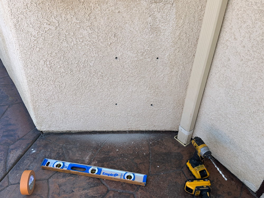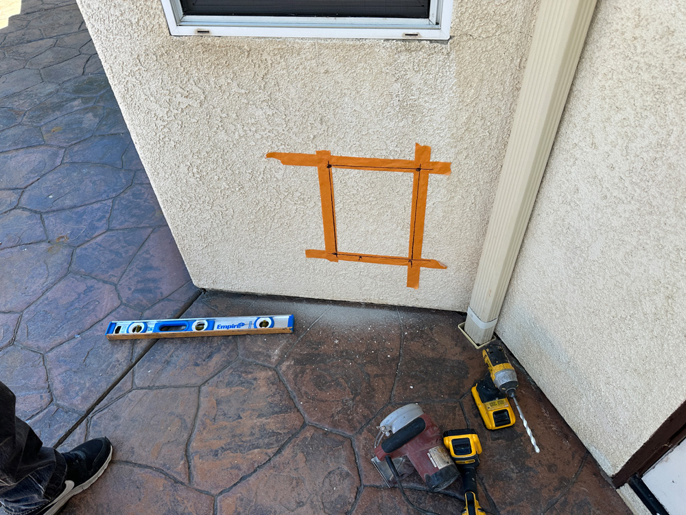 Next, I prepare my tools: a multi purpose tool, a grinder with a diamond blade to cut through the stucco like butter and a drill, and some safety gear, including gloves and goggles. I begin by drilling a few holes at the corners of the marked rectangle, guiding the grinder for a clean cut. The sawdust flies, but I keep a shop vacuum handy to minimize the mess, respecting the homeowner's space.