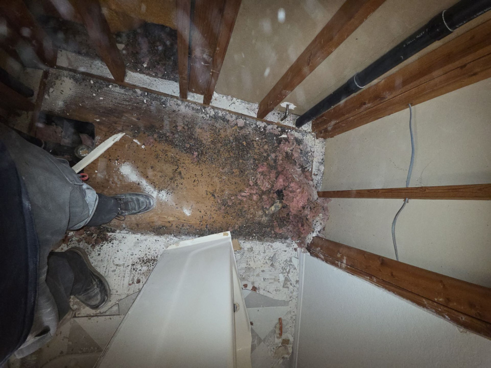 The demolition phase included removal of the tub, vanity, sink, medicine cabinet, light fixtures, and toilet. After removing the tile, hidden damage beneath the tub was discovered and properly addressed before moving forward.