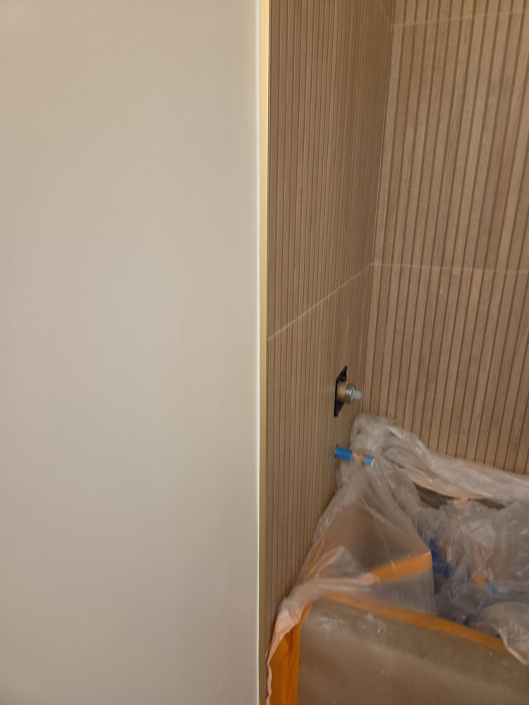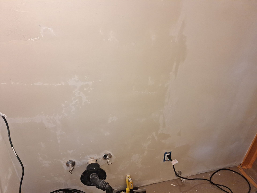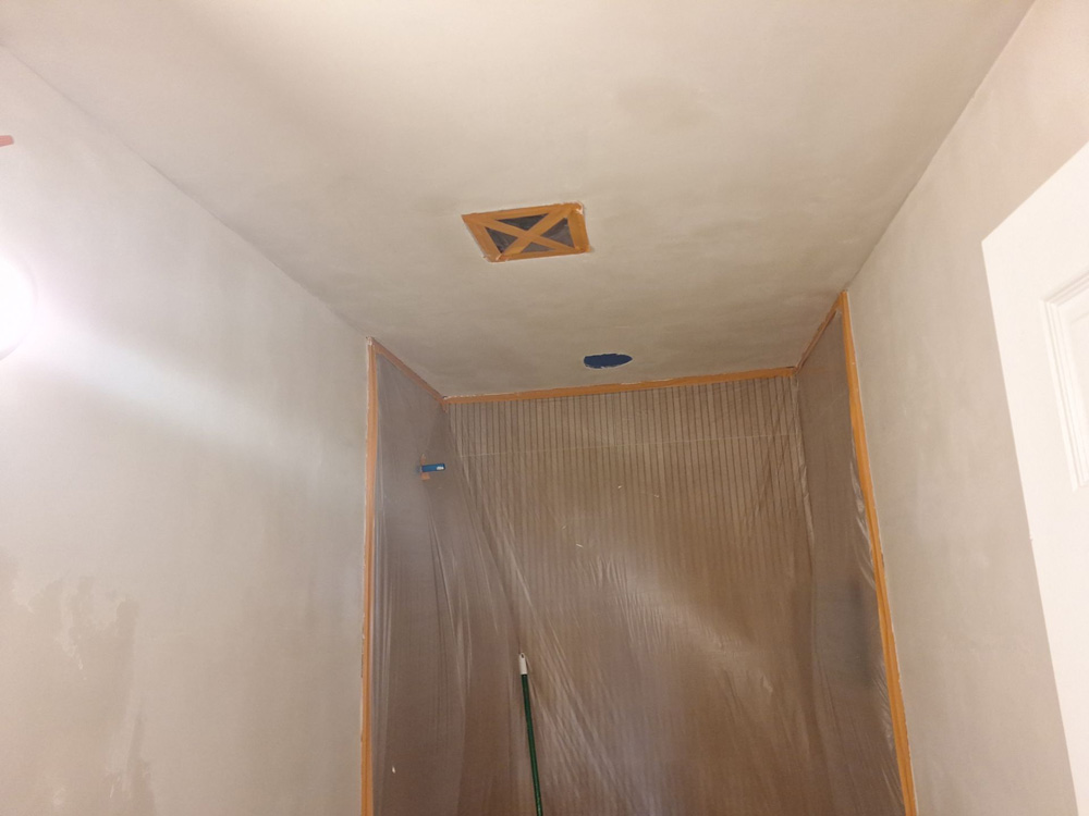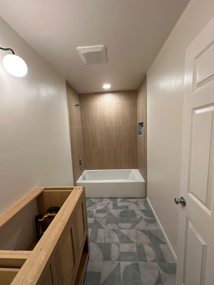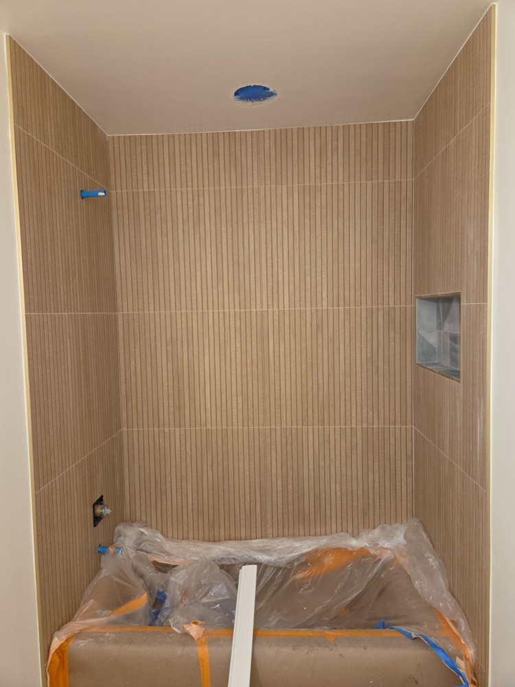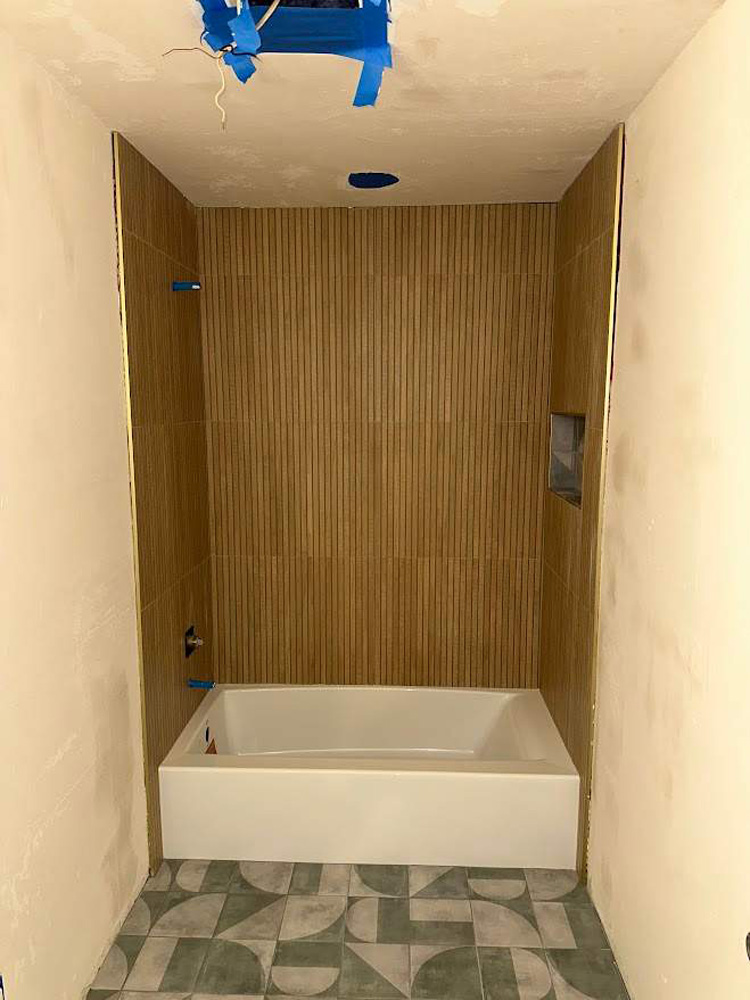 After waterproofing, a new tub was installed along with new wall tile and floor tile. The drywall was skim coated to a semi-smooth finish, sanded, and prepared for paint, with fans used to support drying and curing.
