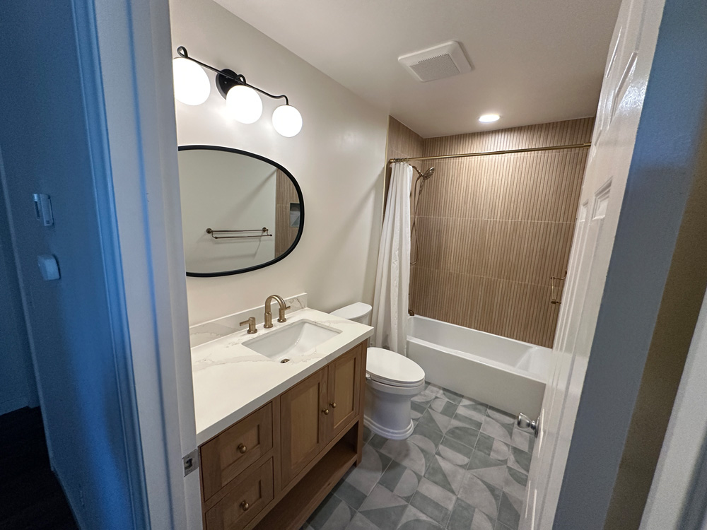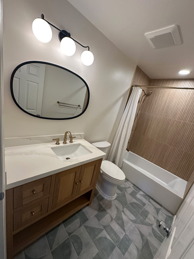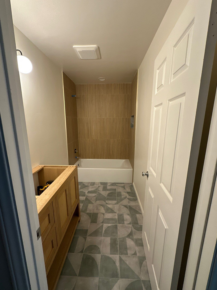 The transformation is remarkable. The client was thrilled! What started as an outdated bathroom with hidden problems is now a clean, modern space that the family can enjoy for years to come. The wood grain tile gives it that contemporary spa-like feel, while the new fixtures and improved lighting make the space both functional and inviting. From addressing the structural issues to delivering quality craftsmanship on every detail, this project showcases what a complete bathroom remodel can achieve.